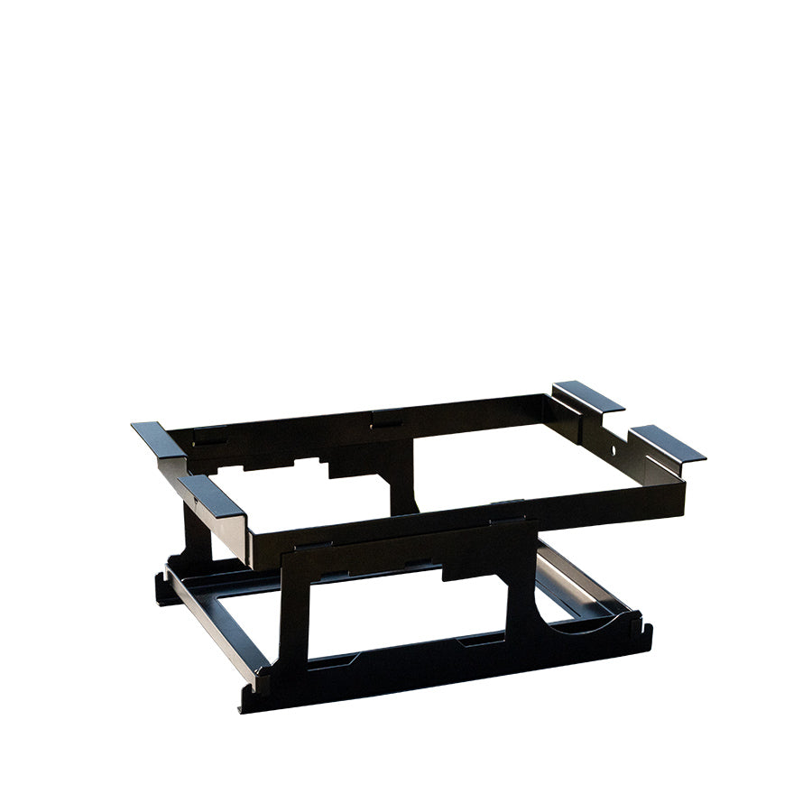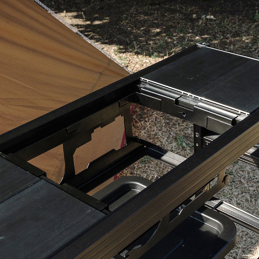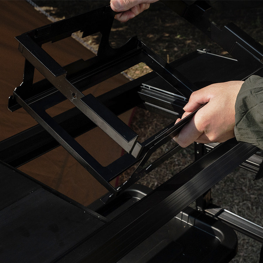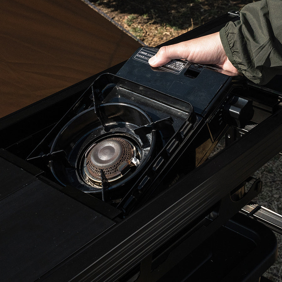 アルミグリルテーブルのIGT規格部分に取り付けることにより、人気のサイズのコンロ(幅28cm × 奥行19cm × 12cmの製品)のインストールが可能になります。組み立てにネジは不要で簡単、さらに取り付けもスムーズ。コンロを使用しない時には、アルミグリルテーブルに付属の天板を乗せることでフラットに。